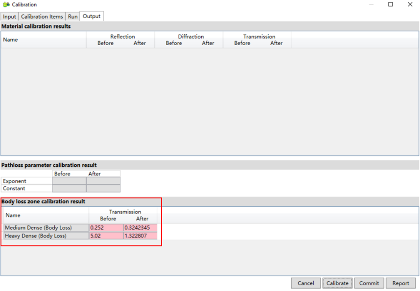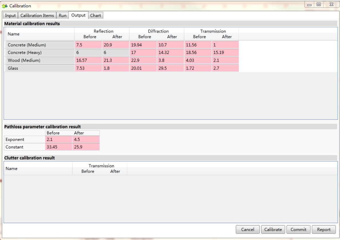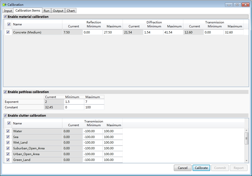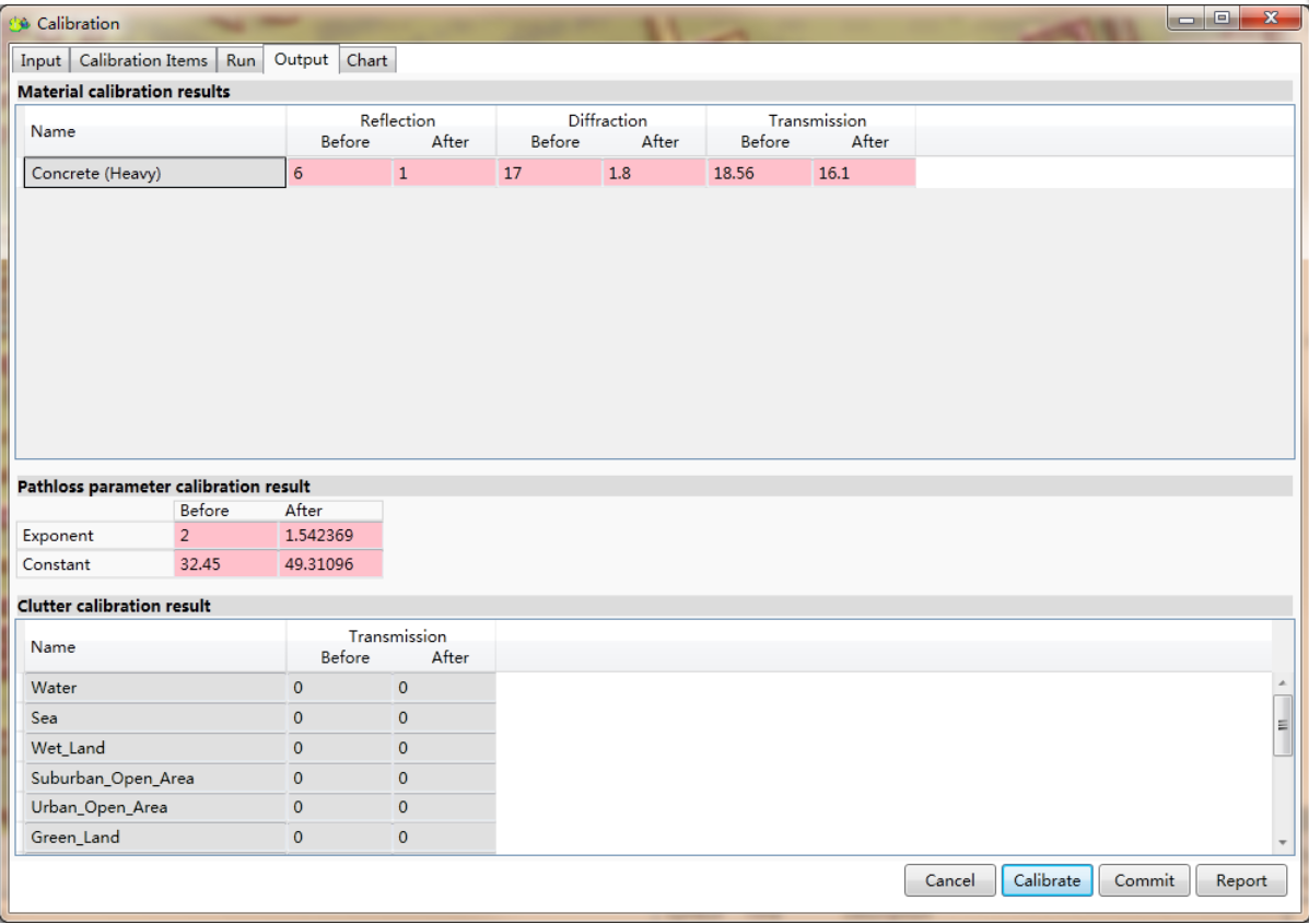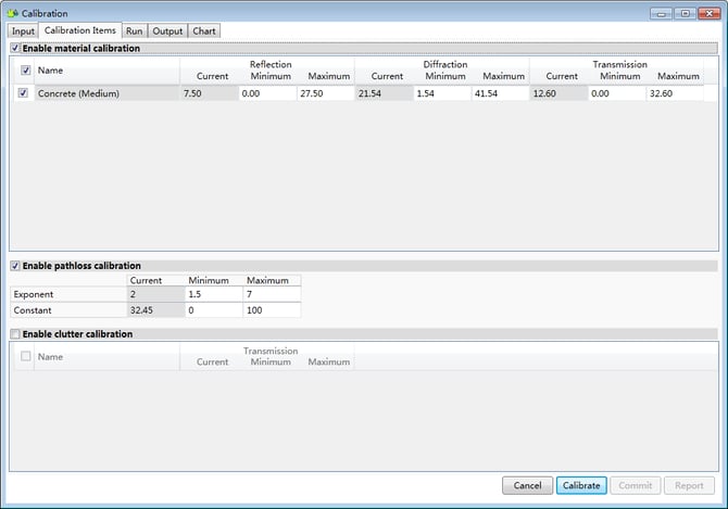 These values are automatically calibrated using the calibration module. After calibration, the calibrated coefficients can be saved in the selected propagation profiles. The calibrated coefficients will not be saved to the material database or clutter database, but you can save the propagation profile and reuse it in other projects by importing and exporting the propagation profile.