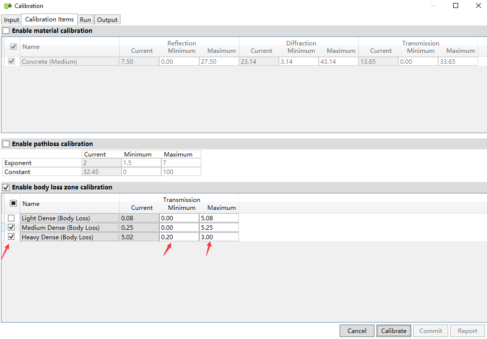 - Enable material calibration. Tick to select the material for calibration, set the Minimum and Maximum Reflection, Diffraction and Transmission parameters.